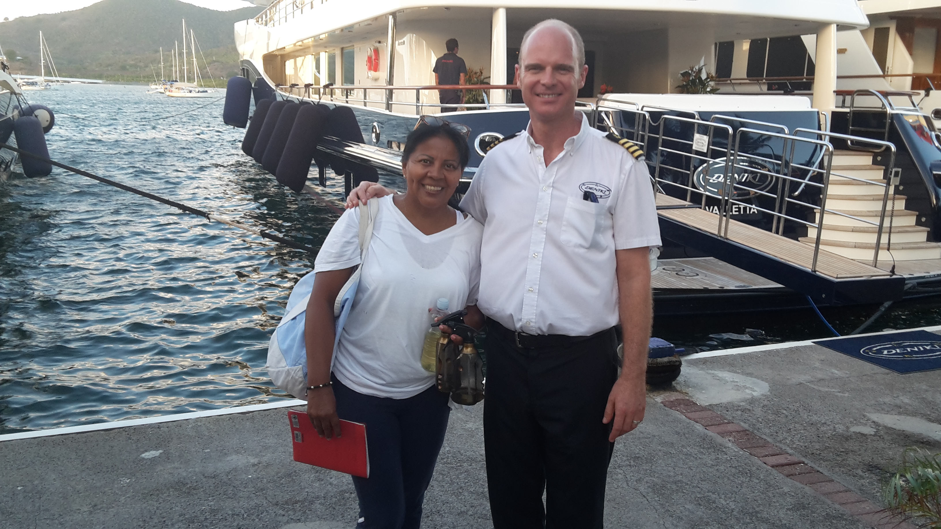 masseuse Gloria posing with the Captain of Valletta yacht.
